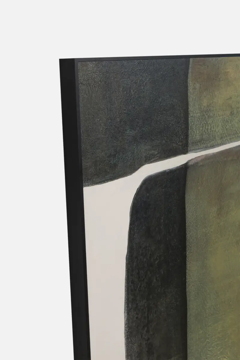 A study in shape, shadow and stillness, EVOKE draws the eye with its layered forms and rich, earthy palette. The interplay of green and charcoal tones feels both grounded and abstract, while the textured surface adds depth and dimension. Framed in slim black aluminium for a crisp, modern finish, this large-scale piece invites quiet contemplation and makes a striking statement in any interior.