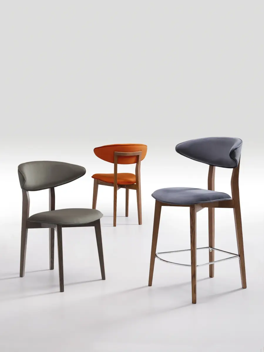 Designed by Dario Delpin who drew inspiration from the heavens and created the FLARE in the shape of a half moon. This curved, upholstered shell encases and supports your back to encourage many hours of comfortable conversation around your counter or bar. Solid Ash legs are sculpted to support the back shell and are stained black/grey to add warmth and design flexibility.